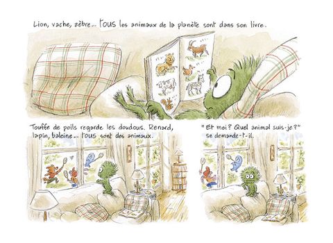 Alors que Touffe de Poil lit dans le salon un livre sur les animaux, il s'interroge. Tous ses amis doudous sont des animaux. « Et moi, quel animal suis-je ? », se demande alors Touffe de Poil... Les auteurs abordent une thématique forte de l'enfance (et pas que...) : l'identité. S'accepter et reconnaître que la différence est une richesse, c'est l'apprentissage d'une vie parfois !
