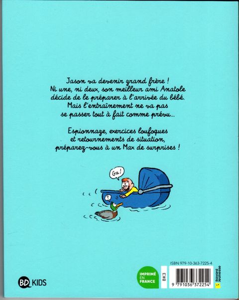 Jason va devenir grand frère ! Ni une, ni deux, son meilleur ami Anatole décide de le préparer à l'arrivée du bébé. Mais l'entraînement ne va pas se passer tout à fait comme prévu... Espionnage, exercices loufoques et retournements de situation, préparez-vous à un Max de surprises !Un petit frère pour JasonCe nouvel album aborde une thématique bien connue des jeunes lecteurs : l'arrivée d'un petit frère ou d'une petite soeur dans la famille. Avec beaucoup d'humour et tendresse, Jason, Anatole et leurs amis expérimentent ensemble cet évènement important. Un héros de presse en album Anatole est un héros multimédia que les lecteurs peuvent retrouver dans J'aime lire tous les mois, mais également à la télévision, en audio, en spectacle et dans des salles d'escape game !