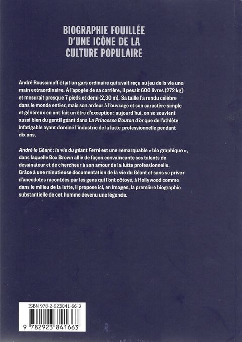 André René Roussimoff de son vrai nom, est né à Coulommiers en France, en 1946. Son physique hors-norme (2,24 m - 235 kg) lui a valut le surnom de la Huitième merveille du monde. Il est connu pour son travail à la fédération de lutte américaine, la World Wrestling Federation, et il est considéré comme l'un des plus grands lutteurs de l'histoire. Mort en 1993, il est à titre posthume le premier homme à être introduit au Hall of Fame de la WWF peu de temps après son décès. Avec André le Géant, Box brown nous offre le portrait remarquable d'une véritable icône de la culture nord-américaine.