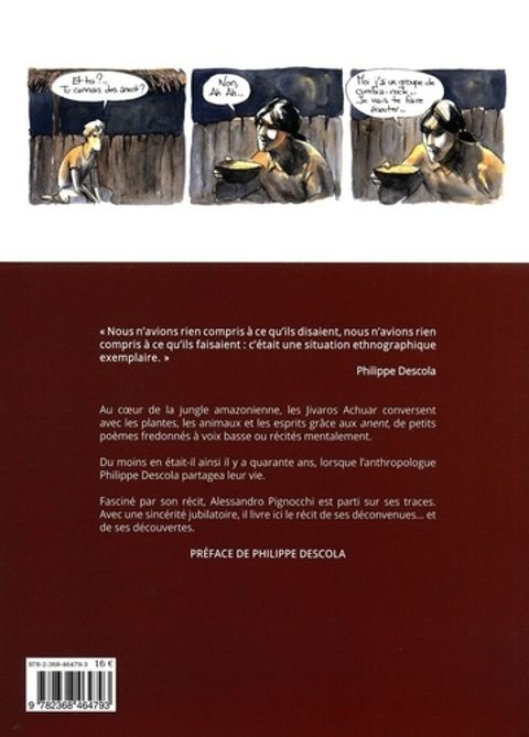 Les anent sont de petits poèmes chantés à voix basse par les Indiens jivaros pour établir une forme de transmission de pensée avec les plantes, les animaux et les esprits. A la fin des années 1970, l'anthropologue Philippe Descola passe trois ans chez les Indiens jivaros, en Amazonie équatorienne. La lecture de ses textes, notamment des Lances du crépuscule, agit sur Alessandro Pignocchi comme un révélateur. Ses expériences d'adolescence avec les Jivaros lui reviennent en mémoire et s'éclairent d'un jour nouveau : de leur vision du monde si riche, que Descola décrit comme l'exact opposé de la nôtre, il n'avait rien vu. Il lui faut repartir. Anent. raconte avec beaucoup d'humour et d'autodérision son expérience avec cette tribu amazonienne, en contrepoint de celle vécue par l'anthropologue Philippe Descola. A travers le décalage entre les deux récits, entre ses tentatives parfois un peu ridicules pour faire ressembler son voyage à celui de Descola, l'auteur explore le fantasme que peut éveiller, chez un citadin occidental, une société qui ne distingue pas la nature de la culture, et qui prête aux plantes et aux animaux une intériorité similaire à celle des humains.