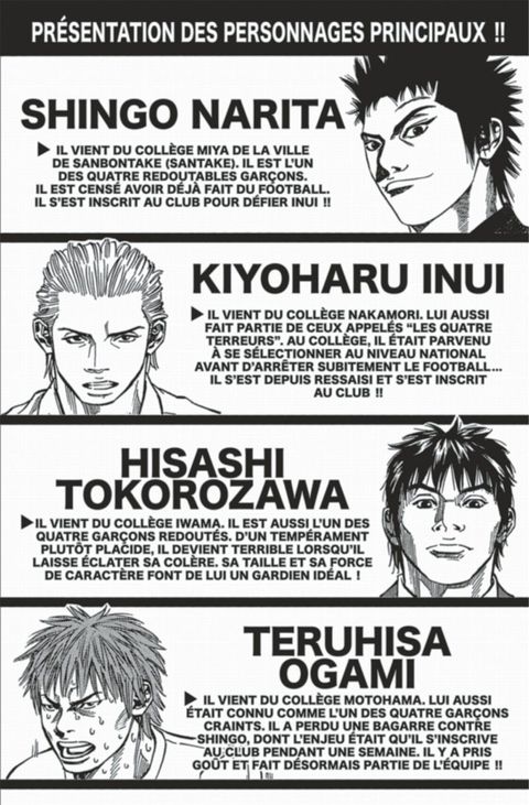Ces élèves bagarreurs vont apprendre ce qu'est vraiment le respect sur un terrain.Des graphismes très réalistes qui nous emportent dans un univers difficile où les poings vont plus viteque les mots.Un manga qui plaira aux lecteurs hermétiques au foot.
