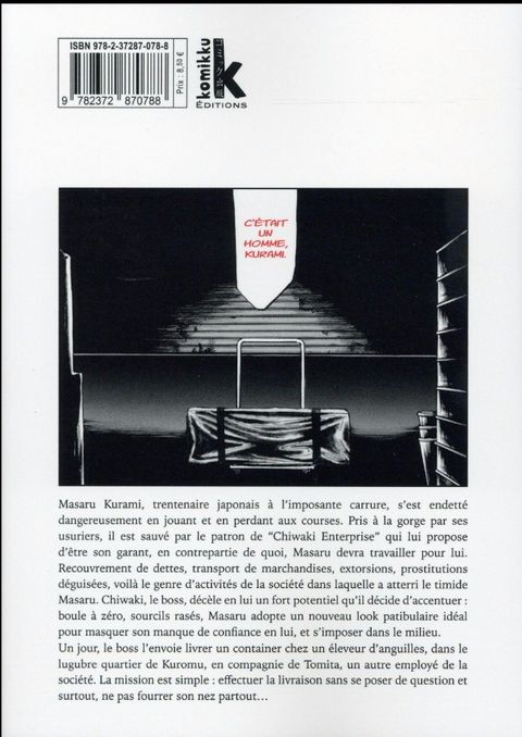 Masaru Kurami est criblé de dettes. Le seul moyen de s'en sortir : un job illégal pour le compte de Mr Chiwaki à la tête d'un empire criminel. Chargé de récupérer les dettes des autres ne sera pas bien difficile pour Masaru, cet homme imposant au visage presque effrayant. Mais le jour où il se verra confier une mission bien étrange, tout basculera dans sa vie qu'il voulait simple et tranquille. Il devra transporter une mystérieuse cargaison de 60 kg dans une ferme d'élevage d'anguilles sans en connaitre le contenu. Mais que contient-elle ? Panique, ambiance oppressante, suspense épouvantable et peur seront au rendez-vous de ce sublime Thriller !