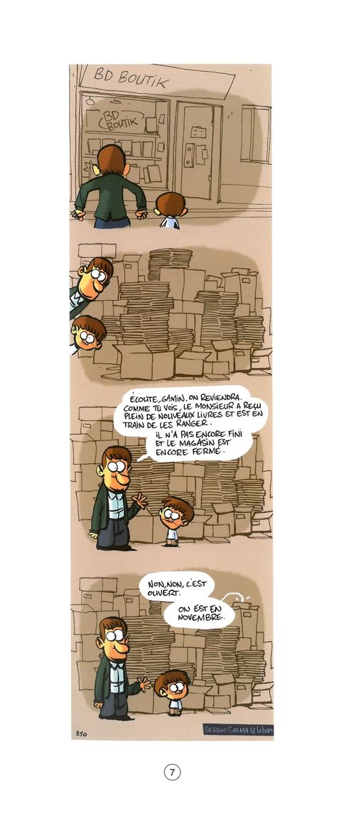 Certes, on ne peut pas tout lire ! Il y a trop ! Malgré cela, le libraire de BD-Boutik essaie de faire son métier le mieux possible, de conseiller efficacement ses clients en fonction de leur profil et de leurs goûts et envies, de déballer les caisses le matin et d'emballer les retours le soir (souvent avec les mêmes albums...), de gérer une trésorerie de plus en plus fragile et de ne pas insulter les dizaines de gamins qui confondent sa librairie avec une papeterie et ce, la veille de la rentrée des classes ! De temps en temps, notre héros craque et envoie tout péter ! Mais même quand il se retrouve sur une plage, il ne peut pas s'empêcher de vendre aux vacanciers les albums qu'il a emportés avec lui. Quand on a le commerce et la bande dessinée dans le sang, c'est pour la vie ! Une série de strips hilarants qui raconte l'envers du décor d'une librairie spécialisée en bande dessinée. Tous les professionnels s'y retrouvent ! Et adorent !