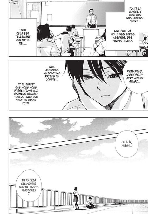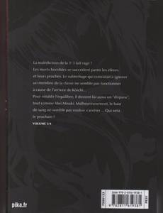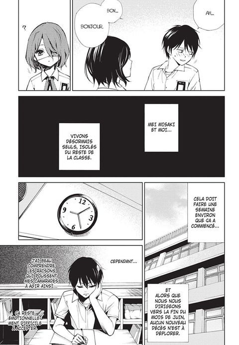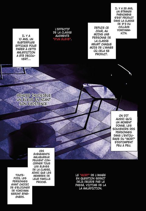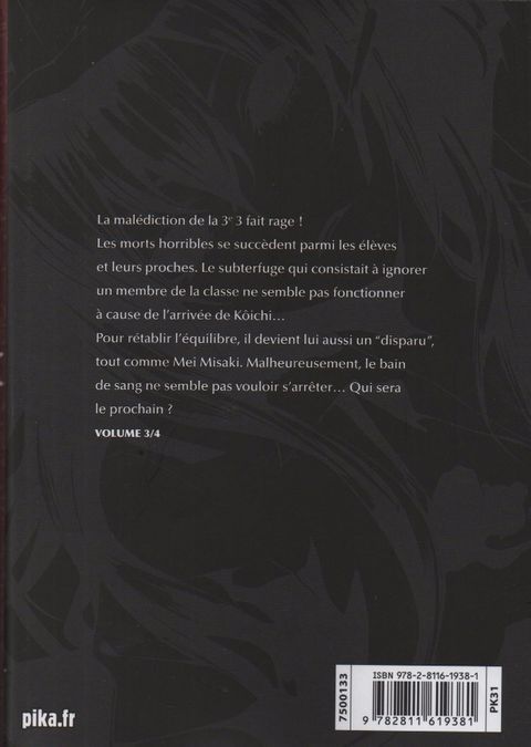 La malédiction de la 3e 3 fait rage ! Les morts horribles se succèdent parmi les élèves et leurs proches. Le subterfuge qui consistait à ignorer un membre de la classe ne semble pas fonctionner à cause de l’arrivée de Kôichi… Pour rétablir l’équilibre, il devient lui aussi un « disparu », tout comme Mei Misaki. Malheureusement, le bain de sang ne semble pas vouloir s’arrêter… Qui sera le prochain ?