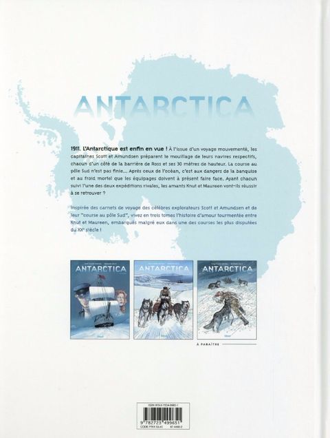 1911. L'Antarctique est enfin en vue ! À l'issue d'un voyage turbulent, les capitaines Scott et Admundsen préparent le mouillage de leurs navires respectifs, chacun d'un côté de la barrière de Ross et ses 30 mètres de hauteur. Car la course au pôle Sud n'est pas finie... Après ceux de l'océan, c'est aux dangers de la banquise et au froid mortel que les équipages doivent à présent faire face. Ayant chacun suivi l'une des deux expéditions rivales, les amants Knut et Maureen vont-ils réussir à se retrouver ? Vivez en trois tomes l'histoire d'amour tourmentée entre Knut et Maureen, placée sous le signe des grands espaces, de la noble aventure et des défis intenses, inspirée des carnets de voyage des célèbres explorateurs Scott et Amundsen et de leur « course au pôle Sud ».
