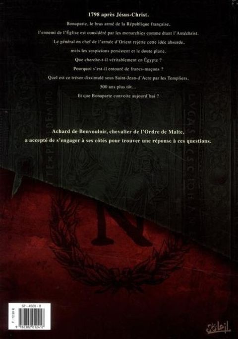 LE VOILE SE LÈVE SUR LE VOYAGE DE NAPOLÉON EN ÉGYPTE. 1798 ap. J.-C. Bonaparte, l'ennemi de l'Église, veut prendre Alexandrie. Mais pourquoi ? Le chevalier Achard de Bonvouloir le suit contre ses convictions. S'il a pactisé avec l'Antéchrist, c'est pour mieux déjouer ses plans. Sa quête n'est pas sans danger. Ses alliés dévoilent en Égypte leur véritable visage. Les francs-maçons sont ici. La résistance musulmane s'organise. La flotte britannique rode. Que cherchent-t-ils ? L'or des Templiers, le pouvoir ou la mémoire du monde ? C'est ce que le chevalier Achard de Bonvouloir va tenter de découvrir.