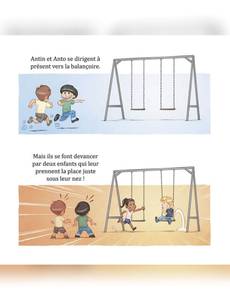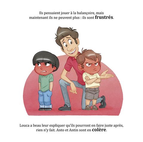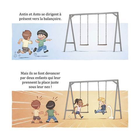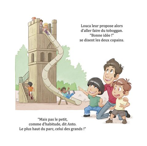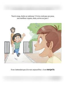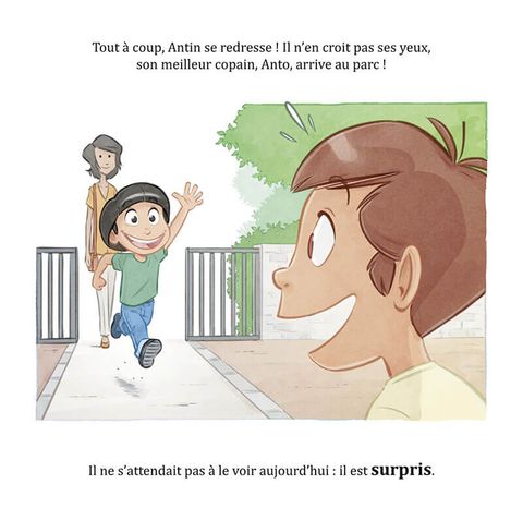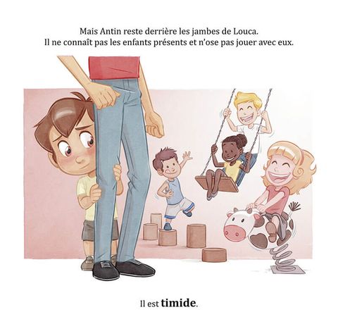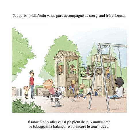 Antin va au parc, accompagné de son grand frère Louca. Il ne connaît pas les enfants présents et n'ose pas jouer avec eux. Il est timide... Tout à coup il se redresse et n'en croit pas ses yeux : Anto, son meilleur ami, arrive au parc. Antin est surpris et heureux. Tout excités les deux enfants se ruent vers les balançoires, mais elles sont toutes occupées... Ils sont frustrés et tristes. Heureusement Louca leur propose de manger une glace et ils sont tout contents. Lorsqu'il est enfin l'heure de rentrer, Anto pique une grosse colère ! Louca explique alors à son petit frère que, quand on est fatigué, on a plus de mal à contrôler ses émotions mais que c'est quelque chose qui s'apprend en grandissant. Antin est en tout cas heureux d'avoir passé une belle après-midi riche en émotions.