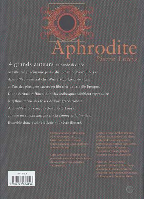Aphrodite est un des chefs d'oeuvre de la littérature érotique, l'un des plus gros succès de librairie de la Belle Epoque. Selon Pierre Louÿs, son auteur, il était conçu comme "un roman antique sur la femme et la lumière". Ecrit pour être illustré, donc. Honneur au maître de la bande dessinée érotique, Milo Manara se devait d'inaugurer cette série de quatre livres, avant Georges Bess puis Claire Wendling.