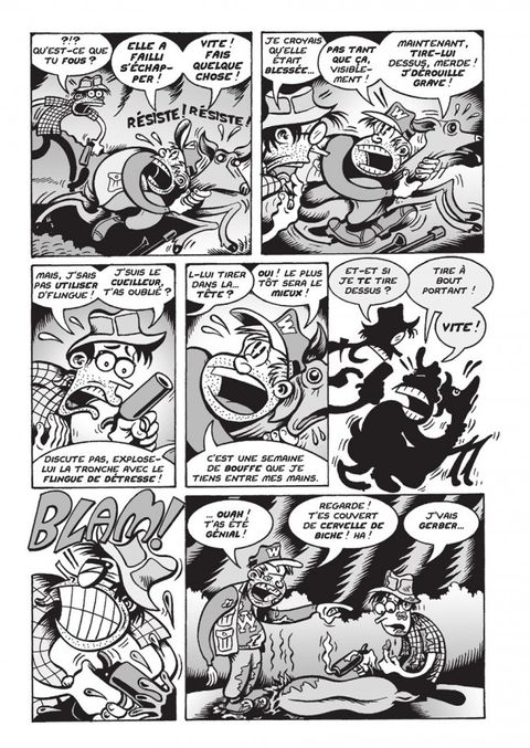 Kim Jong-il balance une bombe atomique sur Seattle, pendant que Perry - informaticien de son état - et Gordo, apôtre du retour à la nature, se baladent dans les bois de la région. Perry et Gordo sont plongés dans l'impitoyable lutte pour la vie dans un décor post-apocalyptique digne d'un The Day After dirigé par Claude Zidi ! Au fil des pages, toujours aux prises avec des situations de plus en plus inconfortables, les deux compères glissent inéluctablement de l'instinct primordial de survie à la dépravation, la cruauté et le mal absolu. Ce qui offre la possibilité à leur créateur de disserter sur des thèmes qui vont des valeurs familiales aux relations entre les sexes, de la paranoïa qui imprègne la société contemporaine aux effets dévastants de la diarrhée ; toujours avec l'humour acéré qui est le sien. Sur un rythme moins frénétique et déglingué que dans Hate ou les Bradleys, Bagge focalise son récit sur des considérations philosophiques sur la vie et la mort et se démontre en tout cas beaucoup plus indulgent avec ses personnages, tels Perry, l'everyman totalement désemparé face à des situations extrêmes. Si le récit se fait plus linéaire et fluide, loin des retournements explosifs de la saga de Buddy Bradley, Peter Bagge reste pourtant incapable de dessiner sans nous pousser au fou rire, même dans les circonstances les plus dramatiques. Proche des dernières expériences de Bagge, qui s'est récemment consacré au journalisme politique dans les pages de Reason ou sur suck.com, Apocalypse Nerd témoigne de l'extraordinaire vitalité créative de cet incontournable auteur.