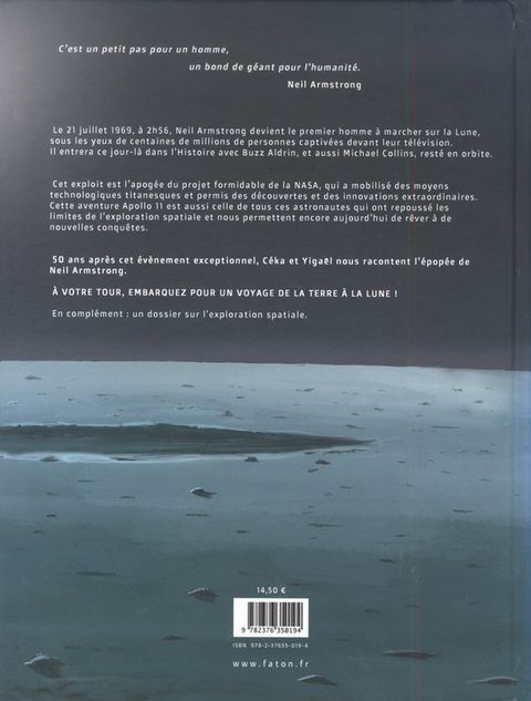Le 20 juillet 1969, 20h18, le module lunaire de la mission Apollo 11 se pose sur la Lune. Quelques heures plus tard, Neil Armstrong devient le premier humain poser les pieds sur notre satellite, sous les yeux de centaines de millions de téléspectateurs. Avec Buzz Aldrin et Michael Collins, ils réaliseront une prouesse humaine et technologique, apothéose d un projet titanesque. 50 ans après cet événement, Neil Armstrong nous raconte cette aventure extraordinaire dans la BD Apollo 11. Depuis ses premiers loopings comme pilote de chasse jusqu'à son premier pas sur la Lune, découvrez un homme au destin formidable, resté humble jusqu au dernier moment.