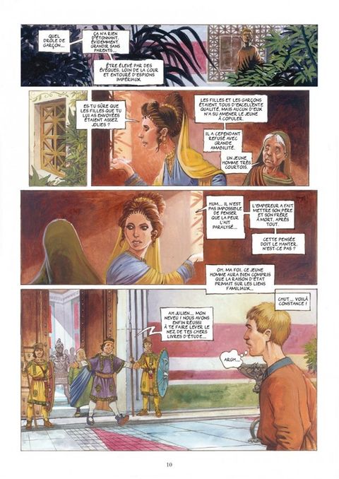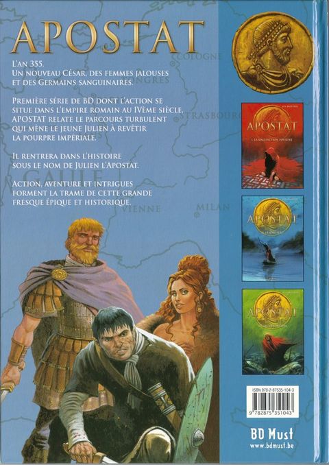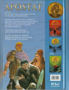 L'an 355. Un nouveau César, des femmes jalouses et des germains sanguinaires. Première série de BD dont l'action se situe dans l'Empire Romain au IVème siècle, Apostat relate le parcours turbulent qui mène le jeune Julien à revêtir la pourpre impériale. Il rentrera dans l'Histoire sous le nom de Julien l'Apostat. Action, aventure et intrigues forment la trame de cette grande fresque épique et historique.
