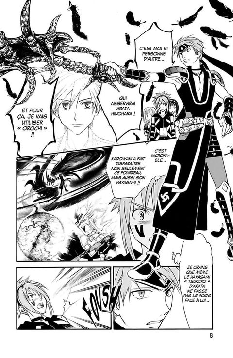 Arata et ses compagnons ont pénétré sur les terres du fourreau Kikutsune...!! Comment vont-ils faire face à l'infâme attaque dont ils vont être la cible ?! Arata et ses compagnons se font tout à coup surprendre par des fourreaux-serviteurs qui attaquent à l'aide du son !! Mis à part Arata qui écoutait de la musique à ce moment-là, tout le monde perd ses tympans!! Comment faire face à ces