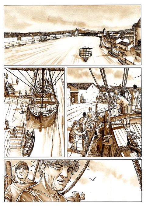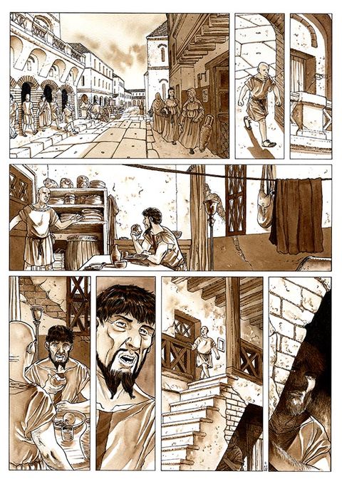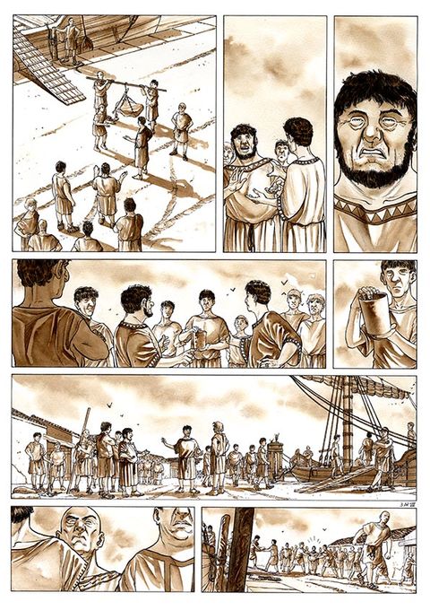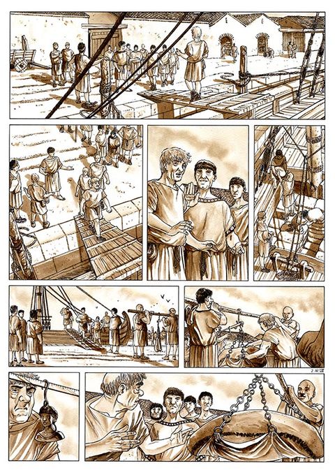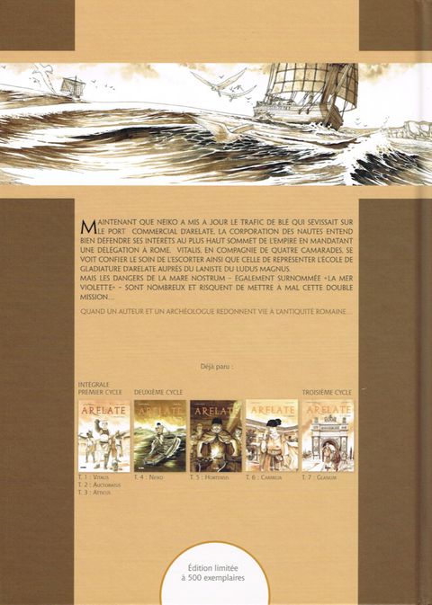 Maintenant que Neiko a mis à jour le trafic de blé qui sévissait sur le port commercial d'Arelate, la corporation des nautes entend bien défendre ses intérêts au plus haut sommet de l'Empire en mandatant une délégation à Rome. Vitalis, et quatre de ses camarades, se voient confier le soin de l'escorter mais aussi celui de représenter l'école de gladiature d'Arelate auprès du laniste du Ludus Magnus, le centre d'entrainement du Colisée de Rome. Mais les dangers sont nombreux sur la mer violette (la méditerranée) et ils risquent de mettre à mal cette double mission⦠* Avant-dernier épisode de la fabuleuse série Arelate, cet album plonge le lecteur une nouvelle fois dans une superbe reconstitution de l'antiquité romaine, soutenue par un graphisme toujours plus rigoureux et précis. *