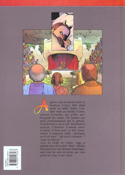 A priori, rien ne devait ternir le bonheur d'aria. Elle allait avoir un bébé. enfin, l'enfant vient au monde. cornu, couvert d'écailles, des griffes prolongeant les mains. ne parlant pas mais communiquant par la pensée. grandissant à vue d'oeil. souffrant le martyre. l'horreur. l'amour aussi. l'amour d'aria pour ce fils monstrueux. l'angoisse enfin : pourquoi est-il né ainsi ? qu'est-il vraiment ? ange ou démon ? Avec la griffe de l'ange, vingt et unième titre de la série " aria ", michel weyland livre une histoire fantastique, dans tous les sens du terme, qui vous prend au coeur et aux tripes.