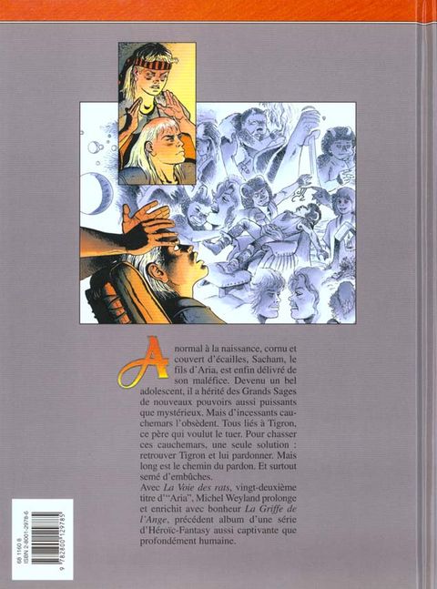 Anormal à la naissance, cornu et couvert d'écailles, sacham, le fils d'aria, est enfin délivré de son maléfice. Devenu un bel adolescent, il a hérité des grands sages de nouveaux pouvoirs aussi puissants que mystérieux. mais d'incessants cauchemars l'obsèdent. tous liés à tigron, ce père qui voulut le tuer. pour chasser ces cauchemars, une seule solution : retrouver tigron et lui pardonner. mais long est le chemin du pardon. et surtout semé d'embûches. avec " la voie des rats ", vingt-deuxième titre d'" aria ", michel weyland prolonge et enrichit avec bonheur " la griffe de l'ange ", précédent album d'une série d'héroïc-fantasy aussi captivante que profondément humaine.