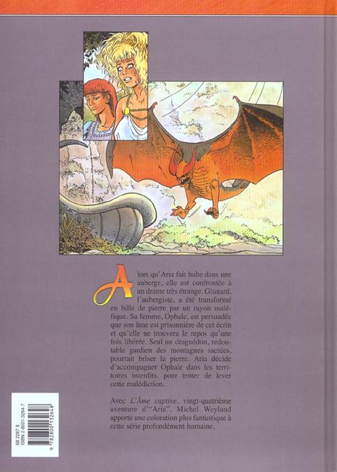 Alors qu'aria fait halte dans une auberge, elle est confrontée à un drame très étrange. Glunard, l'aubergiste, a été transformé en bille de pierre par un rayon maléfique. sa femme, ophale, est persuadée que son âme est prisonnière de cet écrin et qu'elle ne trouvera le repos qu'une fois libérée. seul un draguédon, redoutable gardien des montagnes sacrées, pourrait briser la pierre. aria décide d'accompagner ophale dans les territoires interdits, pour tenter de lever cette malédiction. avec l'âme captive, vingt-quatrième aventure d' " aria ", michel weyland apporte une coloration plus fantastique à cette série profondément humaine.