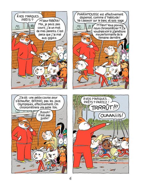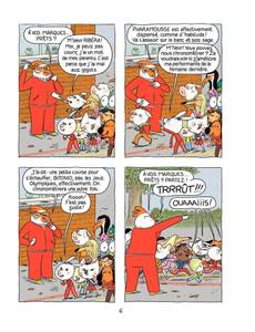 Dans ce 6e tome, Ariol teste le fond de teint pour ressembler à quelqu'un d'autre (et se pose en douceur la question de l'identité.), se creuse les méninges pour organiser son anniversaire (et comprend la cruelle différence entre sa vision idéale et sa réalisation dans la réalité), et fait la course avec ses copains (étudiant au passage les réactions de chacun en situation de compétition.). Bref, c'est une véritable encyclopédie du quotidien en version tendre humoristique !