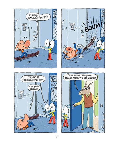Ce nouveau volume met en avant la figure de monsieur Blount, maitre d'école à la fois attentif et exigeant. Rarement rasé mais jamais rasoir, il se montre fin pédagogue en apprenant notamment aux élèves à dessiner un visage avec des chiffres ! L'univers d'Ariol évoque à nouveau maison, loisirs et quotidien : achat compliqué d'un nouvel anorak (les capuches, c'est nul !), pièce de théâtre de fin d'année, asperges au dîner, feu d'artifices... La vie toute simple, quoi, mais avec ce parfum de tendresse et d'humour caractéristique de Guibert et Boutavant. Sept albums et un succès qui ne fait que grandir !