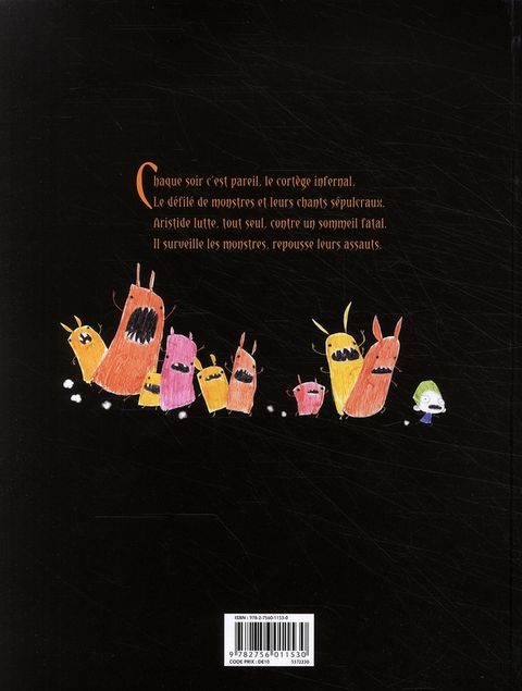 Chaque soir, c'est pareil, le cortège infernal, Le défilé de monstres et leurs chants sépulcraux. Aristide lutte, tout seul, contre un sommeil fatal. Il surveille les monstres, repousse leurs assauts. Il compte chaque minute, il sursaute, il tressaille, Dès que l'un d'entre eux bouge, ou fait le moindre bruit. Il passe ainsi ses nuits à souhaiter qu'ils s'en aillent. Affolé et tremblant, debout sur son grand lit.