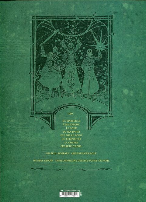 Marseille, 1900. Clément est un ouvrier apprécié de tous. Un homme juste et droit, père de famille, mais dont la vie semble receler d’étranges secrets. Sa mort sera aussi brutale que mystérieuse. Gennevilliers, 1909. Les trois enfants de Clément ont grandi. Livrés à eux-mêmes, privés de leur mère qui croupit en prison, ils n’ont que la faim et la violence comme horizon. Un jour, une femme âgée prend contact avec eux. Elle se dit comtesse et prétend avoir connu leur père. Elle est à la fois étrange et rassurante, excentrique et attachante. Elle s’appelle Aristophania Bolt. Pour les arracher à leur vie de misère, elle les emmène loin de leur grisaille quotidienne et des morsures de l’hiver. Direction le Sud, son soleil et ses calanques, ses rivières et ses paysages sauvages. Direction l’Azur – c’est ainsi qu’elle nomme ce qui ressemble, pour les trois orphelins émerveillés, au Paradis sur terre. Mais il faut se méfier des apparences. Toute médaille a son revers, et l’Azur n’échappe pas à cette règle. Derrière la beauté et la lumière, de sourdes menaces étendent leur ombre. Elles ont pour nom Barboza, le chasseur de rats, ou encore le Roi banni et sa sinistre cour de laquais. Tous attendent leur heure, tapis dans les recoins des quartiers sombres de Marseille. Aristophania, la dernière fée d’Azur, convoquera toutes les ressources de sa magie afin de protéger les enfants et de les révéler à leur Destin… Avec Aristophania, Xavier Dorison et Joël Parnotte inaugurent une saga de French fantasy en quatre tomes, qui navigue entre fantastique flamboyant et réalisme social, entre merveilleux et romantisme noir. Bienvenue en Azur, mais attention à ses dangers…