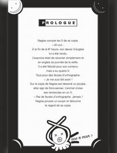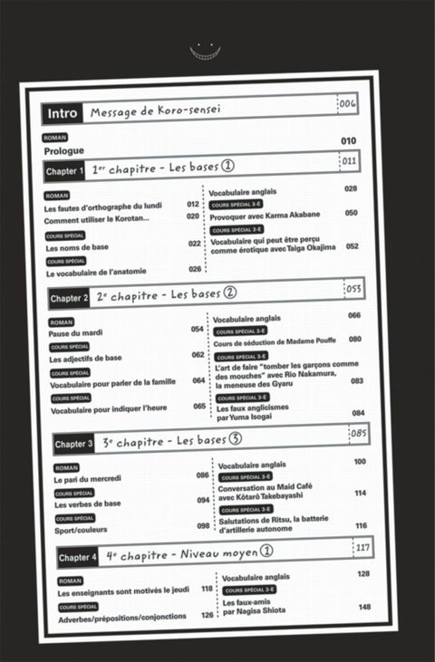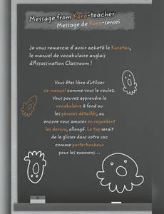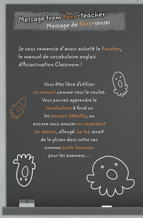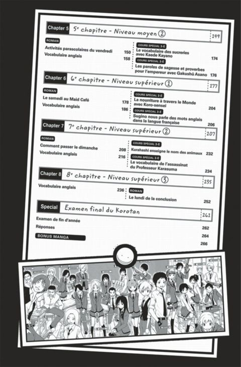 Un manuel de vocabulaire anglais pour les débutants agrémenté d'illustrations tirées du manga. Avec une histoire inédite mettant en scène un cours d'anglais intensif suivi par la classe E.