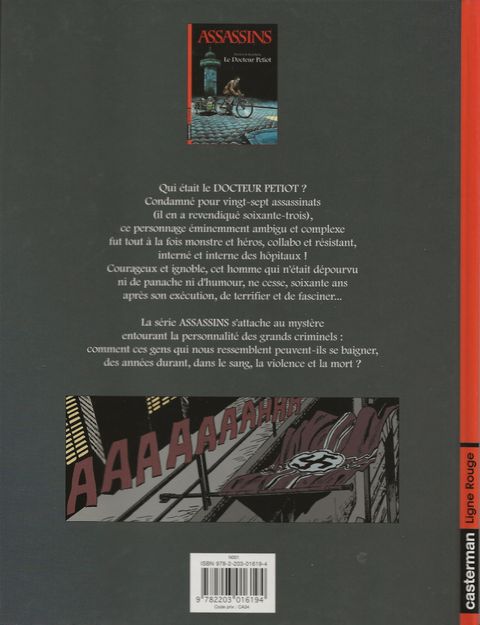 Qui était le docteur Petiot ? Condamné pour vingt-sept assassinats (il en a revendiqué soixante-trois), ce personnage éminemment ambigu et complexe fut tout à la fois monstre et héros, collabo et résistant, interné et interne des hôpitaux ! Courageux et ignoble, cet homme qui n'était dépourvu ni de panache ni d'humour, ne cesse, soixante ans après son exécution, de terrifier et de fasciner... La série assassins s'attache au mystère entourant la personnalité des grands criminels : comment ces gens qui nous ressemblent peuvent-ils se baigner, des années durant, dans le sang, la violence et la mort ?