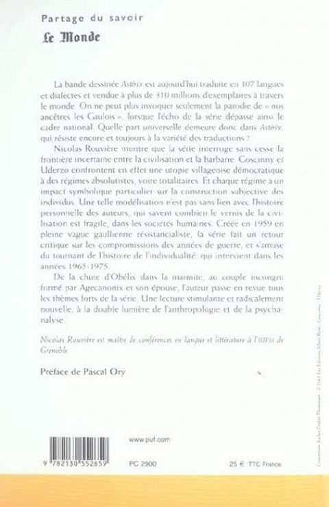Le succès d'Astérix dépasse largement le cadre national, quelle part universelle se trouve dans cette bande dessinée ? L'auteur montre comment la série se trouve sans cesse sur la frontière incertaine séparant civilisation et barbarie. Fils d'immigrés, Goscinny et Uderzo savent par expérience combien le vernis de la civilisation est fragile, en effet qu'est-ce qui garantit dans une société la raison collective ? Créée en 1959, la série fait un retour critique sur les compromissions des années de guerre et s'amuse du tournant de l'histoire de l'individualité qui marque les années 1965-1975. Une lecture originale éclairée par l'anthropologie et la psychanalyse, doublée d'une réflexion sur l'histoire culturelle de notre société et ses fondements mythologiques.