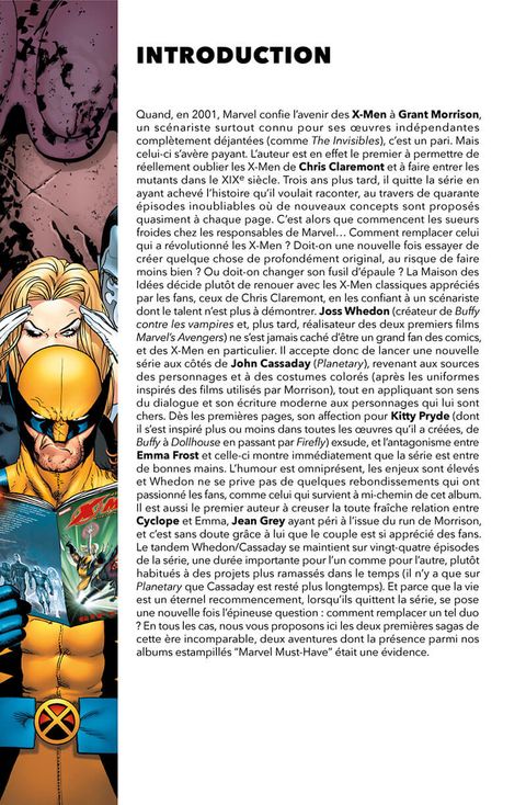 Une nouvelle ère commence pour les X-Men. Cyclope, Emma Frost, Wolverine, Kitty Pryde et le Fauve forment une nouvelle équipe chargée de défendre le rêve de coexistence pacifique entre humains et mutants du Professeur Xavier. Mais un danger inattendu se profile à l'horizon : la généticienne Kavita Rao dit avoir trouvé un remède pour supprimer le gène mutant, semant le trouble dans la communauté mutante. Comment maintenir la formidable dynamique de l'univers mutant après le départ de Grant Morrison de la série New X-Men ? En 2004, Marvel ne pas fait les choses à moitié et se tourne vers Joss Whedon, le créateur de Buffy, qui deviendra quelques années plus tard le réalisateur des deux premiers films Avengers. Au dessin, le trop rare John Cassaday. Ils réalisent des épisodes mythiques dont les douze premiers sont recueillis dans ce volume.