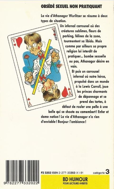 Dans cet ouvrage, MAESTER nous raconte en 9 histoires (de rires), les démêlés d'Athanagor Wurlitzer, obsédé sexuel non-pratiquant, avec les femmes. La drague selon MAESTER, c'est Gaston Lagaffe au royaume des meufs avec, en plus, quelques coups de patte au passage, à la télévision, aux gentils contes de fées (La Pelle au Bois Dormant, le Petit Blouson Noir, le Lapin de Mars) et aux tendres rapports patrons-employés. Le tout, en jouant sur les mots à la manière d'un Raymond Devos. L'humour délirant de MAESTER s'exprime parfaitement dans le sous-titre : "non pratiquant". Et les filles "non pratiquées", surtout quand elles sont dessinées par MAESTER, ont tout ce qu'il faut pour en obséder bien d'autres qu'Athanagor Wurlitzer. A savourer sans complexe.