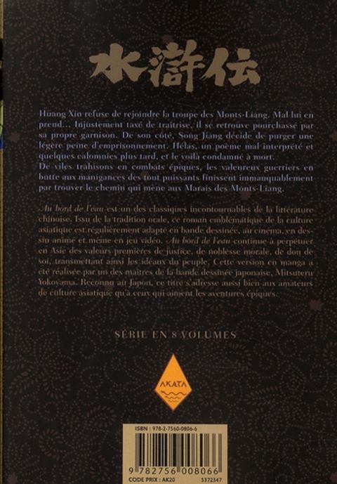 Huang Xin refuse de rejoindre la troupe des Monts-Liang. Mal lui en prend... Injustement taxé de traîtrise, il se retrouve pourchassé par sa propre garnison. De son côté, Song Jiang décide de purger une légère peine d'emprisonnement. Hélas, un poème mal interprété et quelques calomnies plus tard, et le voilà condamné à mort. De viles trahisons en combats épiques, les valeureux guerriers en hutte aux manigances des tout puissants finissent immanquablement par trouver le chemin qui mène aux Marais des Monts-Liang. Au bord de l'eau est un des classiques incontournables de la littérature chinoise. Issu de la tradition orale, ce roman emblématique de la culture asiatique est régulièrement adapté en bande dessinée, au cinéma, en dessin animé et même en jeu vidéo. Au bord de l'eau continue à perpétuer en Asie des valeurs premières de justice, de noblesse morale, de don de soi, transmettant ainsi les idéaux d'un peuple. Cette version en manga a été réalisée par un des maîtres de la bande dessinée japonaise, Mitsuteru Yokoyama. Reconnu au japon, ce titre s'adresse aussi bien aux amateurs de culture asiatique qu'à ceux qui aiment les aventures épiques.