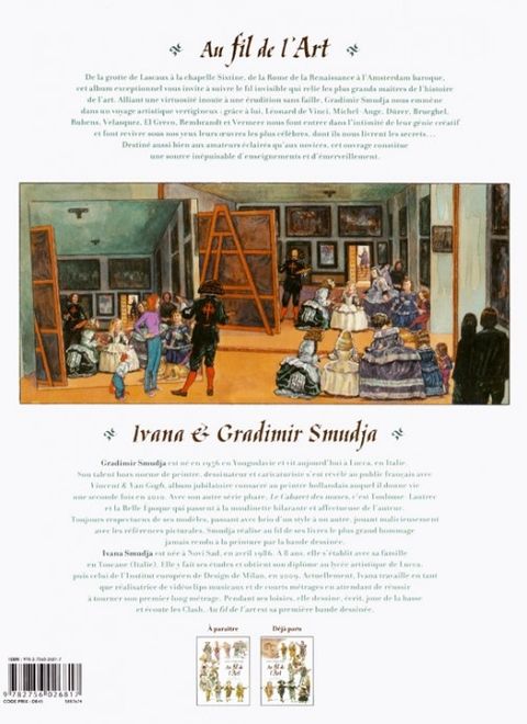 Une petite fille, accompagnée de son chat facétieux, découvre successivement les grottes de Lascaux, les machines volantes et la Joconde de Leonard de Vinci, la chapelle Sixtine de Michel-Ange, le lapin de Dürer, les Ménines de Velasquez, avant de croiser la route de Bruegel, Rubens, El Greco, Rembrandt et Vermeer. Un voyage enchanteur et instructif, sublimé par la virtuosité de Gradimir Smudja.