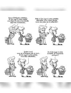 Univers en miniature, le grand magasin voit défiler le monde entier dans ses allées, par besoin ou par envie. Il y a les porteurs de petits paniers qui calculent à la virgule près et les pousseurs de gros caddies qui achètent sans compter. On y croise le petit vieux qui vient meubler ses temps morts et le grand jeune qui vient y gagner sa vie. On s'y promène, on s'y rencontre, on s'y parle. On y mange, on y pleure, on y vit, quoi! Et vu par le petit bout de la lorgnette, qu'est-ce qu'on y rit!