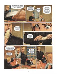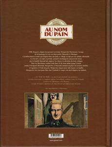 Une recette qui se transmet.1940. Depuis le départ de son mari au front, Marguerite Martineau s’occupe de la boulangerie avec ses deux petits, Marcelin et Monique. L’établissement n’existe que depuis deux ans dans ce village occupé par les soldats allemands. Le travail y est rude et parfois, quand la boulangerie concurrente tenue par la famille Durand fait empirer les choses, la situation devient critique. Mais les Martineau veulent tenir bon. Et ils iront même jusqu’à lutter contre l’occupant allemand. Marguerite et Marcelin mettent en place un système insolite et ingénieux : pour faciliter le réseau de communication de la Résistance, ils cachent leurs messages dans le pain. Malgré les risques pour elle et pour sa famille, Marguerite fera tout pour faire fuir l’ennemi et venger son mari disparu au combat.Prenant et surprenant, Au nom du pain construit sa dramaturgie autour d’un aliment simple et essentiel. Le temps de deux cycles de deux albums, les auteurs racontent 30 années d’Histoire de France. Une saga familiale historique documentée qui amène un vent de fraîcheur au genre, notamment grâce à l’influence du cinéma de Tarantino, Hitchcock et De Palma.