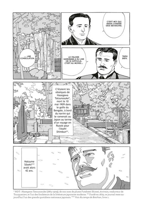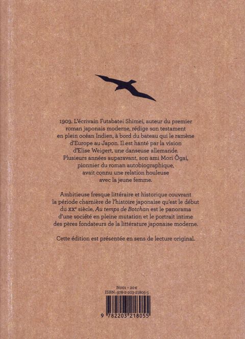 1909. L'écrivain Futabatei Shimei rédige son testament à bord du bateau qui le ramène au Japon. Il est hanté par la vision d'Elise Weigert, une danseuse allemande. Quelques années plus tôt, son ami Mori Ogai, qui allait inventer le roman autobiographique à la japonaise, avait fait primer son devoir sur ses sentiments et rompu sa liaison avec la jeune femme. Ambitieuse fresque littéraire et historique couvrant le période charnière de l'histoire japonaise qu'est le début du XXᵉ siècle, Au temps de Botchan est le panorama d'une société en pleine mutation et le portrait intime des pères fondateurs de la littérature japonaise moderne.