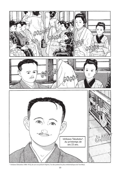Japon, 1909. Ishikawa Takuboku se fait dérober son porte-monnaie par Tomita Ginzo, le roi des pickpockets. Mais comme il ne contient pas d’argent, celui-ci le remet en place… Cette fois, Jirô Taniguchi et Natsuo Sekikawa illustrent quelques mois de la vie de Takuboku, un jeune homme imparfait, en conflit permanent avec lui-même et le quotidien, pour qui la poésie est le seul refuge. Il aura fallu douze ans à Jirô Taniguchi et Natsuo Sekikawa pour achever la vaste fresque qu’est Au temps de Botchan. Toujours en sens de lecture occidental, en voici le troisième volet. Les deux derniers volumes paraitront en 2013.