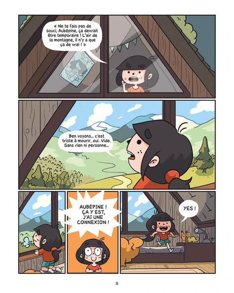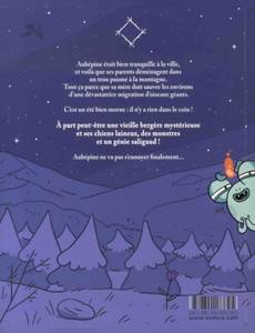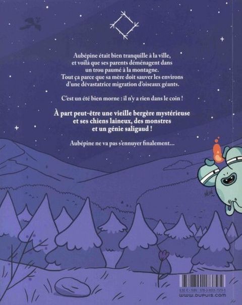 Entre les montagnes, dans une vallée perdue que la civilisation n'a pas encore pu trop atteindre, tous les quinze ans, une grande migration d'oiseaux gigantesques ravage tout sur son passage, et surtout le petit village en bordure de la vallée. C'est dans ce village qu'Aubépine se voit contrainte de suivre ses parents, afin que sa mère, une éminente scientifique, puisse endiguer la nouvelle migration. Seulement voilà, Aubépine est une citadine, et le changement brutal d'environnement ne lui plaît guère. Elle se retrouve malgré elle à vagabonder dans la montagne, où elle fera notamment la rencontre d'une mystérieuse bergère, d'un petit chiot qui devra lui servir de compagnon autant que de gardien, et surtout d'un génie ancestral perdu au fond de la forêt: le Génie Saligaud. Aubépine est maligne, mais manque de sagesse, et sa solitude exacerbée par les bouleversements de son quotidien lui fait faire les mauvais choix qui mettront son existence ainsi que celle de toute la montagne en danger. Une bataille se profile, de nombreuses vies sont en péril, et c'est par son intelligence qu'Aubépine devra résoudre cet épineux problème. Réalisée par Mlle Karensac au dessin et Thom Pico au scénario, Aubépine, entre humour pop et avalanche de péripéties, bouscule la BD jeunesse !