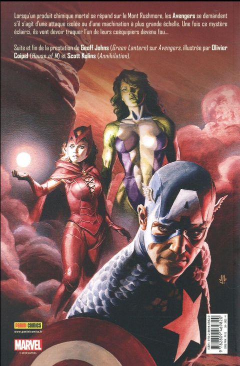 Un produit chimique mortel s'est répandu sur le Mont Rushmore. Est-ce une attaque isolée ou une machination à grande échelle ? C'est ce que doivent découvrir les Avengers, dans ce récit imaginé par Geoff Johns et dessiné par la star française Olivier Coipel. Les héros partent aussi à la recherche de Miss Hulk.