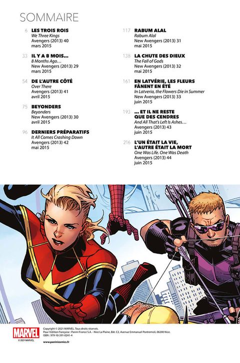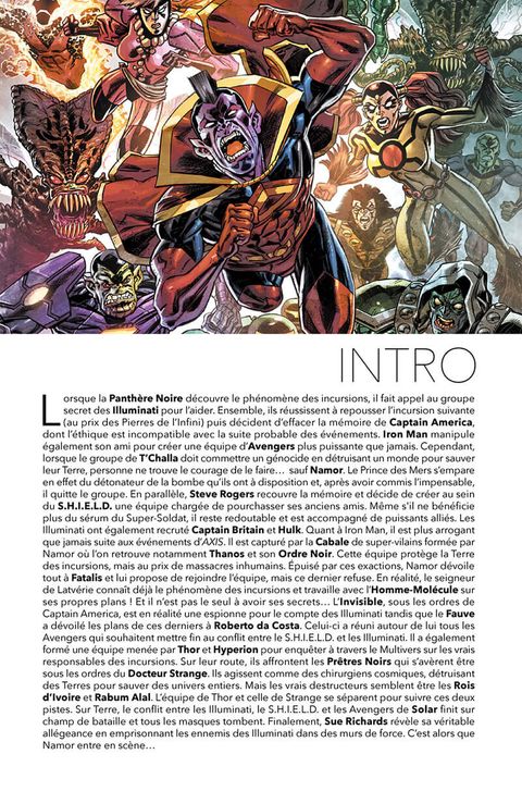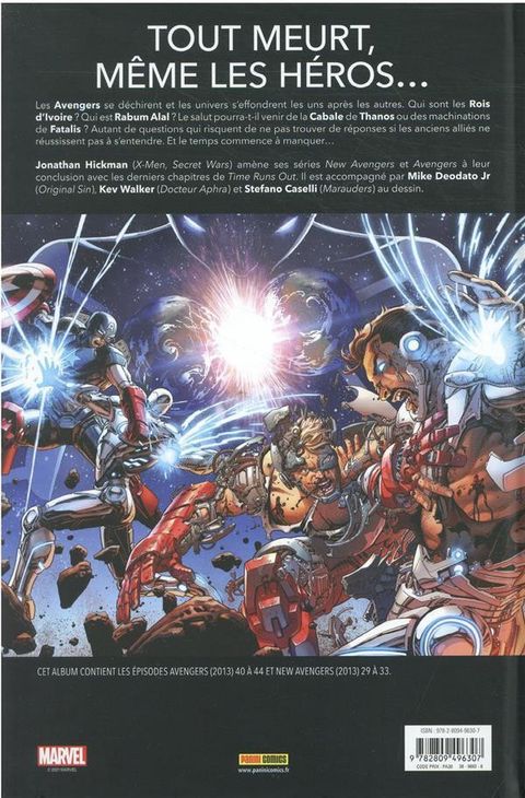 Thanos et la Cabale détruisent des versions parallèles de la Terre et leurs univers avec ! Mais que peuvent faire les Avengers alors qu'ils sont désorganisés, brouillés, et que mettre fin au massacre de la Cabale pourrait signer la mort de notre réalité ? Le salut peut-il venir du Docteur Fatalis ? Toutes les trames tissées par Jonathan Hickman depuis le début des séries Avengers et New Avengers (rééditées récemment en MARVEL DELUXE) trouvent leur conclusion ici, avec un affrontement décisif entre les Avengers et Thanos, et un autre encore plus essentiel entre Fatalis et les Beyonders. Les événements de ce volume débouchent sur la saga Secret Wars. Contient les épisodes US : • Avengers (2013) #40-44, • New Avengers (2013) #29-33.