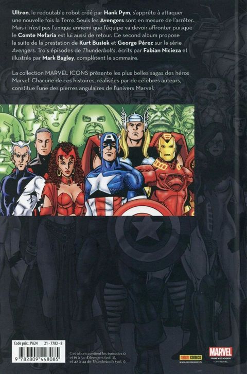 Le redoutable robot et ennemi de l'humanité connu sous le nom d'Ultron attaque une nouvelle fois la Terre et seuls les Avengers sont en mesure de le neutraliser ! L'équipe part ensuite en Afrique du Sud, la patrie de Griffe d'argent, et affronte le Comte Nefaria aux côtés des Thunderbolts. Kurt Busiek et Georges Pérez poursuivent leur remarquable prestation dédiée aux plus grands héros de l'univers Marvel.
