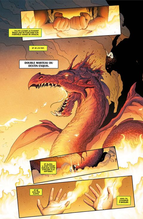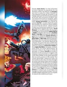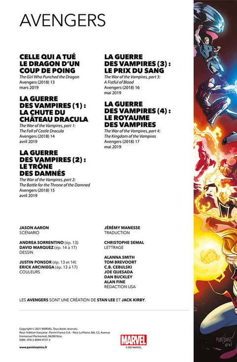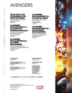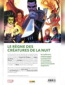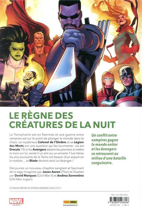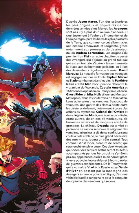 Lorsque Dracula, Seigneur des Vampires, demande l'asile politique à la Russie, c'est le prologue d'un combat sanglant entre les Avengers, et un nouveau groupe de vilains démoniaques qui cherchent à renverser le célèbre suceur de sang. Pour l'occasion, les héros recrutent un spécialiste en la matière : Blade, le chasseur de vampires. Quand Ghost Rider se fait posséder par l'ennemi, la victoire des Avengers devient cependant incertaine. Sans compter qu'il y a un traître au sein de l'équipe ! Dans cet album également : les origines préhistoriques de la première incarnation d'Iron Fist. Bien que l'on ignore encore si Blade apparaîtra au cinéma ou à la télé, on sait déjà qu'il sera interprété par Mahershala Ali puisque Kevin Feige l'a annoncé à la Comic Con 2019. La synergie entre l'univers cinématographique Marvel et les comics étant désormais bien rodée, le chasseur de vampires a aussitôt intégré les Avengers, et on peut faire confiance à Jason Aaron (Thor) pour que le scénario justifie cette apparition !