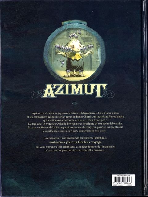 Après avoir échappé au jugement d’Irénée le Magnanime, la belle Manie Ganza et sa troupe de saugres atterrissent sur le triste royaume volant du baron Chagrin. Ce dernier, personnage mythique s’il en est, aurait réussi à vaincre la vieillesse… mais à quel prix ? De leur côté, le professeur Aristide Breloquinte et l’équipage de son navire-laboratoire Le Laps, continuent d’étudier la question épineuse du temps qui passe, et semblent avoir leur petite idée quant à la récente disparition du pôle Nord…La fantastique épopée tragi-comique d’Azimut se poursuit ! Son graphisme soigné, son inventivité rare et la richesse de son univers ont déjà séduit à la fois public et critiques, avec un premier tome récompensé à plusieurs reprises.