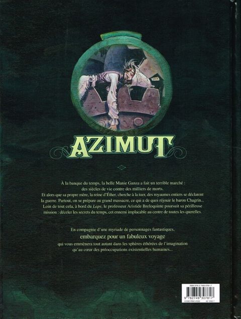 À la banque du temps, la belle Manie Ganza a fait un terrible marché : des siècles de vie contre des milliers de morts. Et alors que sa propre mère, la reine d'Éther, cherche à la tuer, des royaumes entiers se déclarent la guerre. Partout, on se prépare au grand massacre, ce qui a de quoi réjouir le baron Chagrin... Loin de tout cela, à bord du Laps, le professeur Aristide Breloquinte poursuit sa périlleuse mission : déceler les secrets du temps, cet ennemi implacable au centre de toutes les querelles.Avec Azimut, Wilfrid Lupano - que l'on ne présente plus - nous livre une épopée tragi-comique d'une inventivité folle, un chef d'oeuvre de nonsense peuplé d'une galerie de personnages fantasques que n'aurait pas reniés Lewis Caroll. Autre responsable de cette réussite : Jean-Baptiste Andreae, dont le somptueux travail en couleurs directes finit de donner à cette série son cachet si particulier.