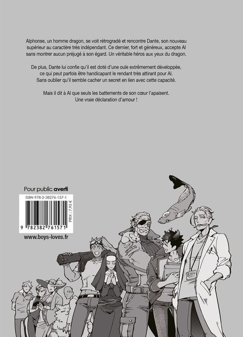 Alphonse, un homme dragon, se voit rétrogradé et rencontre Dante, son nouveau supérieur au caractère très indépendant. Ce dernier, fort et généreux, accepte Al sans montrer aucun préjugé à son égard. Un véritable héros aux yeux du dragon.De plus, Dante lui confie qu'il est doté d'une ouïe extrêmement développée, ce qui peut parfois être handicapant le rendant très attirant pour Al. Sans oublier qu'il semble cacher un secret en lien avec cette capacité.Mais il dit à Al que seuls les battements de son coeur l'apaisent. Une vraie déclaration d'amour !