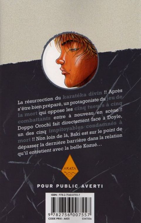 La spirale des combats s'accélère encore ! L'attentat du siège du shinshin-kai précipite une escalade de la violence qui s'abattra sur un des condamnés à mort. Baki, de son côté, connaît un des combats les plus durs de sa vie contre Yanagi l'empoisonneur. Le maître de celui-ci pourrait lui donner la clé de la victoire... Mais à quel prix oe