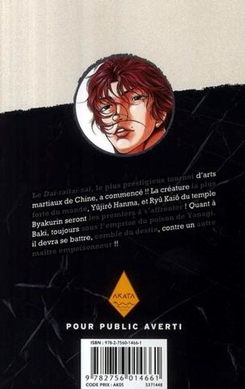 Le daï-rataï-saï, le plus prestigieux tournoi d'arts martiaux de Chine, a commencé!! La créature la plus forte du monde, Yûjirô Hanma, et Ryû Kaïô du temple Byakurin seront les premiers à s'affronter! Quant à Baki, toujours sous l'emprise du poison de Yanagi, il devra se battre, comble du destin, contre un autre maître empoisonneur !!