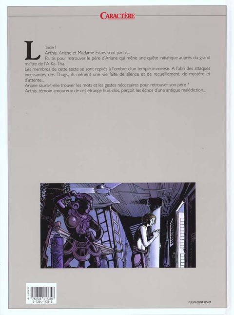 L'Inde ! Arthis, Ariane et Madame Evans sont partis... Partis pour retrouver le père d'Ariane qui mène une quête initiatique auprès du grand maître de l'A-Ka-Tha. Les membres de cette secte se sont repliés à l'ombre d'un temple immense. A l'abri des attaques incessantes des Thugs, ils mènent une vie faite de silence et de recueillement, de mystères et d'attente... Ariane saura-t-elle trouver les mots et les gestes nécessaires pour retrouver son père ? Arthis, témoin amoureux de cet étrange huis-clos, perçoit les échos d'une antique malédiction...