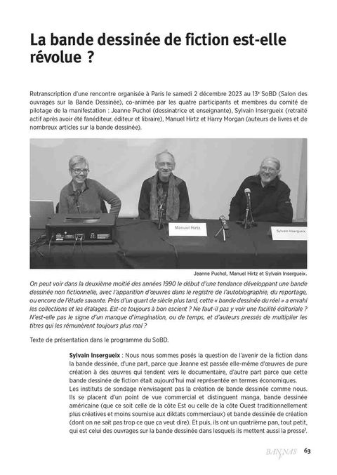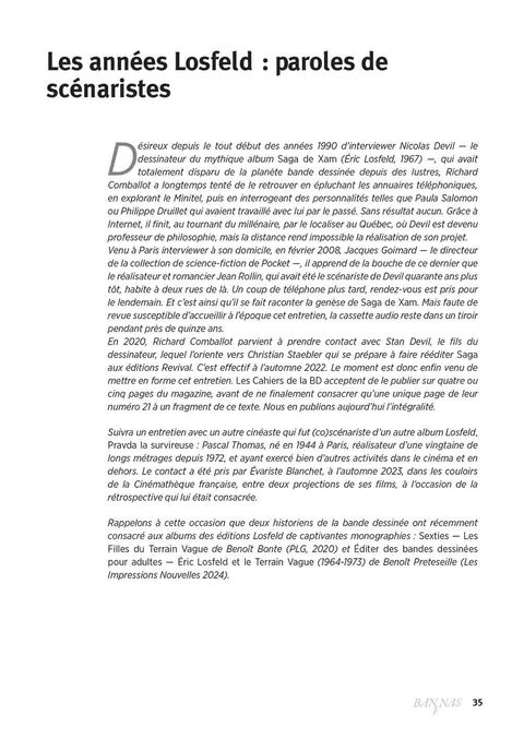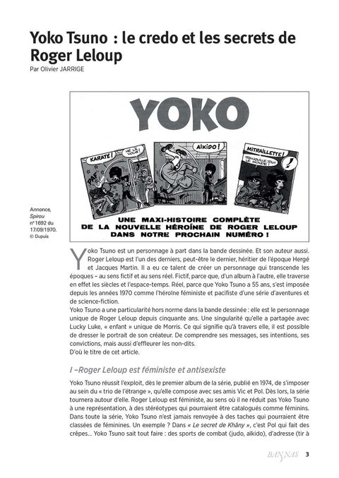 BANANAS est une revue critique annuelle d'Histoire de la bande dessinée qui en explore souvent des pans mal connus ou négligés. Ainsi, dans ce n°17, une archive à propos des dessinatrices de BD. SOMMAIRE : Yoko Tsuno : le credo et les secrets de Roger Leloup, par Olivier Jarrige , Guy Mouminoux (1927-2022) : trois vies, une Åuvre, par Évariste Blanchet , Les années Losfeld : paroles de scénaristes , Saga de Xam : entretien avec Jean Rollin, par Richard Comballot , Pravda la survireuse : La vérité sur (ou selon) Pascal Thomas, par Évariste Blanchet , Mat, chantre de la bande dessinée populaire, par Jean-Jacques Lalanne , Table ronde du 13e SoBD : La bande dessinée de fiction est-elle révolue ? , «Â Mille castors ! » -  À propos du Cap'tain Swing et de quelques autres, par Manuel Hirtz , À la recherche de Jules Stromboni - étape 1 : Le Futuriste, par Pierre-Gilles Pélissier , Archives : Où sont les femmes ?, par Évariste Blanchet et Jean-Paul Jennequin , Benoît Barale, Fabrice Neaud.