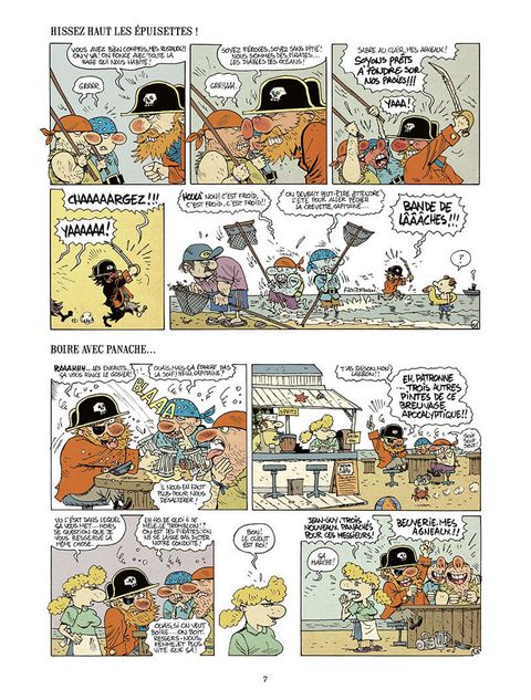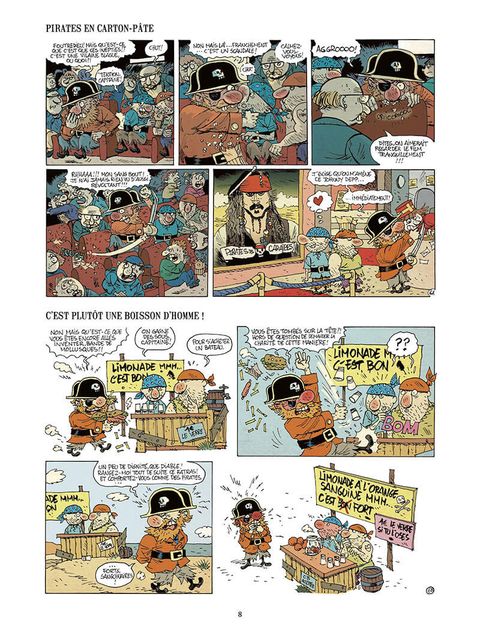 Dans sa vie d'avant, le Capitaine écumait les océans. Il tranchait la tête de ses ennemis d'un coup de sabre. Flibustier sans peur et sans pitié, il inspirait la crainte sur les sept mers, et même au-delà. Mais ça, c'était avant. Aujourd'hui, à la suite d'un bug temporel inexpliqué, le voilà projeté à notre époque en compagnie de deux de ses fidèles marins. Et la vie au XXIe siècle, pour un pirate habitué à faire régner l'enfer sur mer, c'est carrément l'enfer sur Terre ! Le voilà réduit à rançonner les livreurs de restauration rapide, à nettoyer lui-même ses vêtements dans une laverie automatique et à mendier un travail dans les bureaux d'« En avant l'emploi ». Quand il ne joue pas les gardes d'enfants dans une garden party, il se retrouve poissonnier dans un supermarché... Loin des aventures du célèbre Barbe-Rouge, avec lequel le héros de cet album (ou anti-héros, plutôt) affiche une certaine ressemblance, Bande de pirates est un recueil de gags savoureux en une demi-page. Le souffle de la grande aventure a laissé place à celui de l'humour, mais ce n'est pas le lecteur qui s?en plaindra !