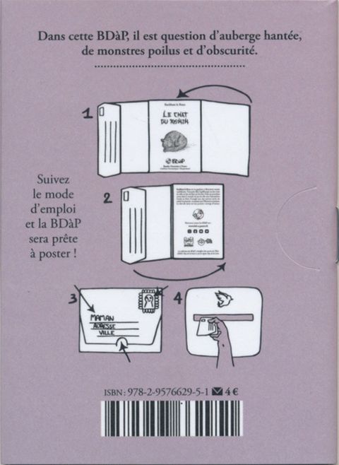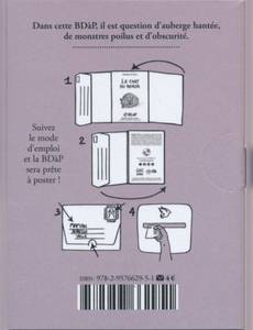 Où il est question d’auberge hantée, de monstres poilus et d’obscurité.Le principe d'une BDàP est simple : un livre de seize pages intérieures en petit format (7,5 x 10,5 cm) avec une couverture comprenant quatre volets repliables, à un prix de vente accessible (4 €). Un emplacement pour une adresse et un timbre à coller est intégré à la couverture afin de pouvoir les expédier par La Poste.