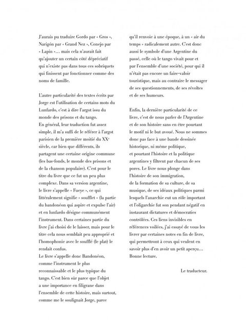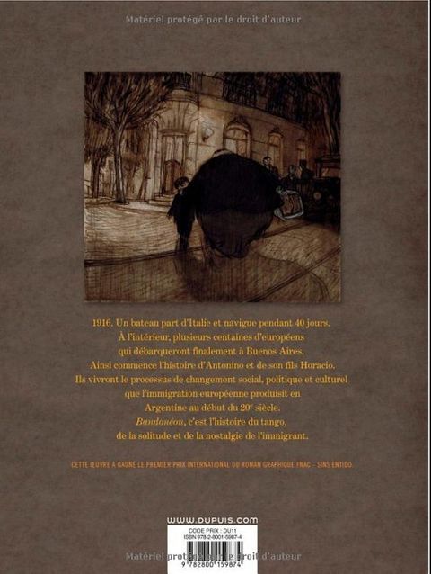 "Bandonéon", c'est, entre autres, le récit de la destinée d'Horacio, enfant prodige au piano, fasciné par les musiciens de tango, devenu ce jeune homme doué, prêt à tout pour devenir l'égal des notables viveurs dont il envie l'aisance. Il ne reculera devant aucune compromission pour arriver, enfin, même si pour cela il lui faudra se renier soi-même et s'en mordre les doigts quand l'illusion se sera dissipée, et que la vie aura filé... Mais "Bandonéon", c'est aussi le récit, par Jorge Gonzalez, de son retour en Argentine, le temps de rendre visite à ses amis et sa famille. L'occasion d'une plongée introspective dans ce que créer, être argentin, aimer le tango, partir et revenir veulent dire.
